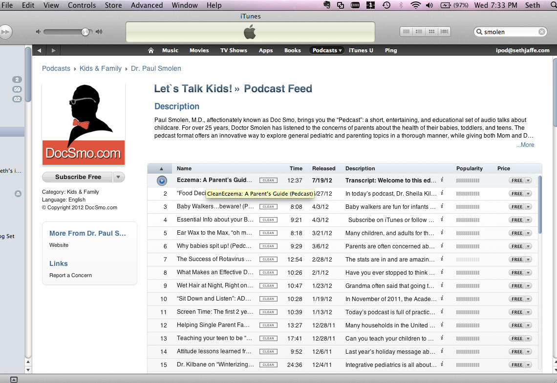 You’ll be taken to the DocSmo podcast page on the iTunes store. There you can download select podcasts at will, or just choose the “Subscribe Free” button in the top left corner.